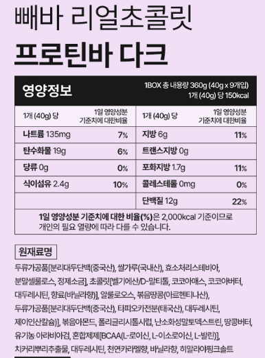 | 저당·혈당 안정형 (다이어트, 공복 간식) | 🟤 빼바 리얼초콜릿 프로틴바 다크 |